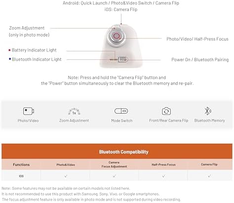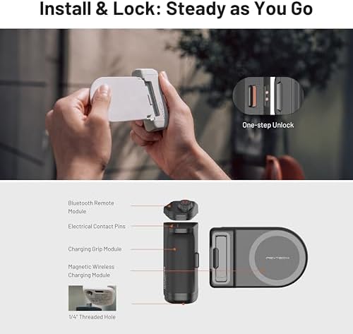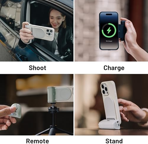 About this item [3-in-1 Detachable Design]: A modular smartphone photography grip designed for photography enthusiasts, featuring wireless charging and focus adjustment functionality. Includes: Magnetic Wireless Charging Module, Charging Grip Module, Bluetooth Remote Module [Wireless Charging for the Moment]: Built-in 3000mAh 18650 battery and coil, support MagSafe magnetic wireless charging. 18N vertical pull force prevents movement, with dual-sided magnet to attach an additional fill light. [Highlight Design]: It can transform into a sleek magnetic phone stand with one click, thickness 3.5mm, self weight 48g [Charging Grip+Bluetooth Remote]: Grip module can becomes a compact 10W power bank anywhere. The bluetooth remote is a magnetic design that turns it into a 10m remote control to control your camera and catch every awesome moment without a hitch [Flexibility in use]: The wireless charging and grip modules feature a quick-release design for a secure connection. Switch hassle free from portrait to landscape without changing your grip. Use grip module as a desktop stand for reviewing your shots and videos [Compatibility & Expand]: Compatible with iPhone 12~iPhone 16 series, Huawei Mate series, P series, Xiaomi 15/14/13 series and so on. Features 1/4” thread on the bottom for tripod and accessory compatibility. [Note]: When charging the phone, the battery also powers the Bluetooth module to ensure it remains charged › See more product details
